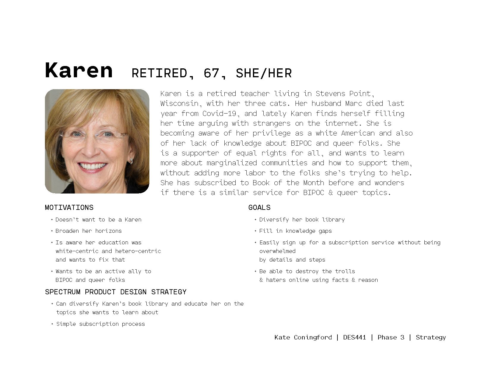 For this Interface Design class project, I created Spectrum, a monthly book subscription service which researches, curates, and delivers books by BIPOC and/or LGBTQIA+ authors based on the user’s genre, topic, and content preferences.